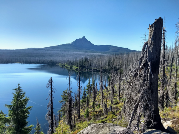 Image: Big Lake, Oregon (same lake seen in the remote sensing picture) following 2012 Shadow Lake Fire. Mt. Washington can be seen in the background. (Credit: Sebastian Busby)