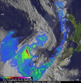 The GPM or Global Precipitation Measurement mission core observatory satellite had a good look at Fehi’s remnants as it was nearing New Zealand. GPM flew above the Tasman Sea on January 31, 2018 at 1725 UTC (February 1, 2018 at 6:25 a.m. NZDT). Rainfall data collected by GPM's Microwave Imager (GMI) and Dual Frequency Precipitation Radar (DPR) instruments showed rain moving onto the coast of New Zealand's South Island.