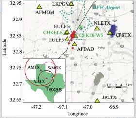 Image: Study area for the DFW Airport earthquake sequence. Yellow triangles are the 2008-2009 SMU operated stations. Blue asterisks are the earthquakes reported by the 2013-2016 SMU earthquake catalog, indicating continued seismicity at the DFW Airport -- its boundaries indicated by the dotted blue-green line. Solid black line is the DFW Airport fault. (Credit: SMU)