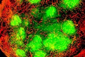 Image: A tumor with green patches of vaccinia virus infection surrounded by red blood vessels. (Credit: Donald McDonald Lab)