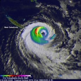 The Global Precipitation Measurement mission or GPM core observatory satellite's Microwave Imager (GMI) instrument had a fairly good view of Tropical Cyclone Gita on February 16, 2018 at 0316 UTC (Feb. 15 at 10:16 a.m. EST). GPM's Dual Frequency Precipitation Radar (DPR) swath only covered the area west of GITA's main area of precipitation. The weakening tropical cyclone was passing the southeastern tip of New Caledonia. Although weakening, Gita still had winds estimated at over 90 knots (104 mph). Rainfall derived from GMI data showed that the heaviest precipitation, falling at rate of about 51 mm (2 inches) per hour, was shown west of Gita's eye. GPM is a joint mission between NASA and the Japan Aerospace Exploration Agency, JAXA.