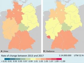 The team measured the change of light emissions for every German state, studying both the lit area and total radiance. The trends in the lit area show a clear distinction between East and West. The lit area of the states of the former GDR including Berlin stayed basically the same (growth less than 1 per cent), whereas the states in the western part of Germany increased in the area that is lit in the night. The lit area in Thuringia decreased by about 7 percent. With respect to the intensity of the lighting, the picture is more complex. Large areas in both East and West Germany show only marginal changes, while some states show growth rates of three to four per cent annually. Once again, Thuringia decreased in radiance.