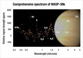 Image: Using Hubble and Spitzer, astronomers analyzed the atmosphere of the "hot Saturn" exoplanet WASP-39b, and they captured the most complete spectrum of an exoplanet's atmosphere possible with present-day technology. By dissecting starlight filtering through the planet's atmosphere into its component colors, the team found clear evidence for water vapor. Although the researchers predicted they would see water, they were surprised by how much water they found - three times as much water as Saturn has. This suggests that the planet formed farther out from the star, where it was bombarded by icy material. (Credit: NASA, ESA, G. Bacon and A. Feild (STScI), and H. Wakeford (STScI/Univ. of Exeter))