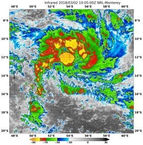 The Moderate Resolution Imaging Spectroradiometer is the instrument aboard NASA’s Aqua satellite that provided the infrared data on Tropical Cyclone 11S. Imagery from March 2 at 5:05 a.m. EST (10:05 UTC) showed coldest cloud top temperatures in storms circling the low-level center of circulation and in a large fragmented band of thunderstorms in the northern quadrant on the tropical cyclone. Temperatures in those areas were as cold as minus 80 degrees Fahrenheit (minus 62.2 Celsius).Cloud top temperatures that cold indicate strong storms that have the capability to create heavy rain.