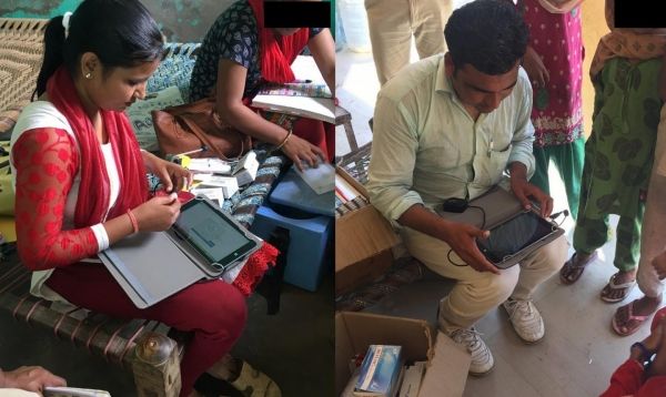 Image: Healthcare workers in Haryana, India using tablets to log and access. (Credit: Sanjay Jain and team)