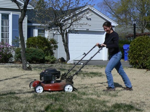 Image: Ecologist Susannah Lerman of UMass Amherst mowing a suburban lawn that was part of her study of bee populations and diversity. In exchange for participation, homeowners got free lawn mowing from the researchers, who cut roughly 350 miles of grass over the two-year study. (Credit: UMass Amherst)