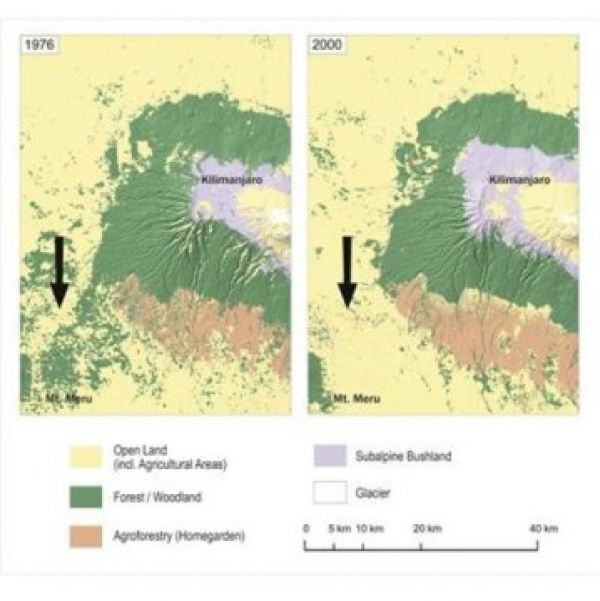 Image: Much of the natural forest vegetation between Mount Meru and Mount Kilimanjaro vanished between 1976 and 2000. (Illustrations: Andreas Hemp)