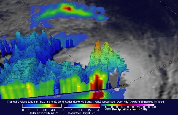 Tropical cyclone Linda had winds of about 45 knots (52 mph) when the GPM core observatory satellite flew above on March 13, 2017 at 0701 UTC. Data collected by GPM's Microwave Imager (GMI) and Dual Frequency Precipitation Radar (DPR) showed that convective storms close to Linda's center of circulation were producing very heavy rainfall. GPM's radar (DPR Ku Band) probed storms in an area of strong convection just southeast of Linda’s center of circulation that were dropping precipitation at a rate greater than 181 mm (7.1 inches) per hour.