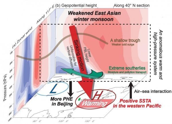 Image: Schematic diagram summarizing the dynamic connection between the increased SSTA in the northwestern Pacific and the increasing PHE in Beijing through the weakening East Asian winter monsoon system. (Credit: Lin Pei)