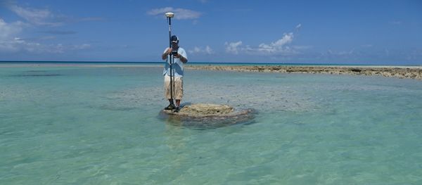 Photo: Fieldwork on a microatoll, next to the Makemo Island. (Photo UNIGE/Elias Samankassou)