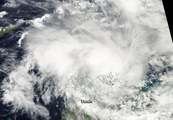 NASA’s Aqua satellite provided a visible light image of Marcus after it developed. The Moderate Resolution Imaging Spectroradiometer, or MODIS, instrument aboard Aqua revealed that Marcus’s center of circulation just north of the Cobourg Peninsula. The image showed powerful thunderstorms circled the low-level center and extended in a band west of the center.
