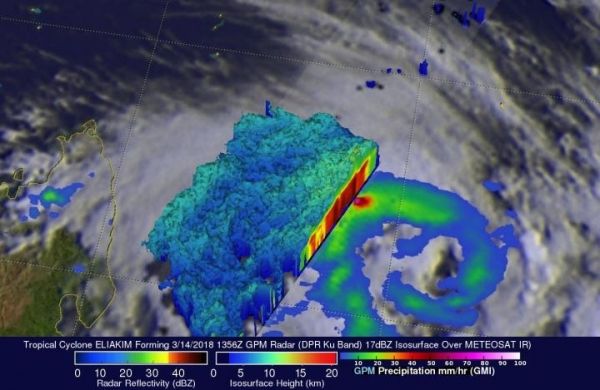 Image: On March 14, 2018, at 11:56 a.m. EDT (1356 UTC) GPM's DPR found that a few storms in the northwest quadrant of Eliakim were dropping rain at a rate of over 205 mm (8.1 inches) per hour. (Credit: NASA/JAXA, Hal Pierce)