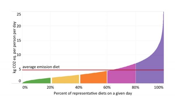 They ranked the diets by their associated greenhouse gas emissions, from lowest to highest, then divided them into five equal groups, or quintiles. The researchers found that the 20 percent of U.S. diets with the highest carbon footprint accounted for 46 percent of total diet-related greenhouse emissions.