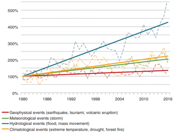 Globally, according to the new data, the number of floods and other hydrological events have quadrupled since 1980 and have doubled since 2004, highlighting the urgency of adaptation to climate change. Climatological events, such as extreme temperatures, droughts, and forest fires, have more than doubled since 1980. Meteorological events, such as storms, have doubled since 1980.