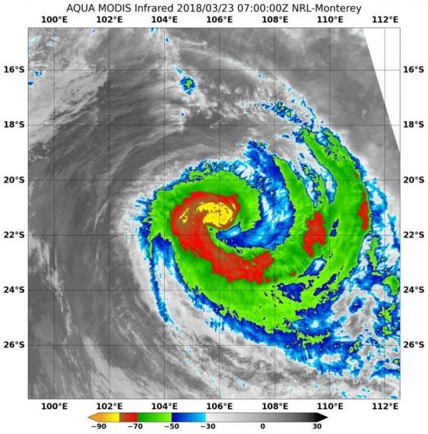 MODIS data also showed a small area with colder cloud tops circling Marcus’ center. NASA research indicates very cold cloud tops with the potential to generate very heavy rainfall. Since Marcus is far from land, its rain is falling over the open waters of the Southern Indian Ocean.