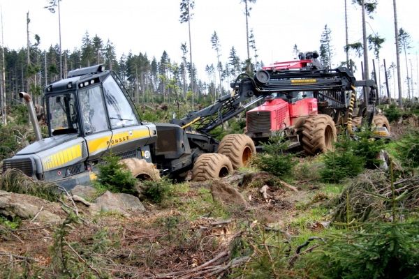 Image: Salvage logging in the Bavarian Forest National Park according to the national park regulations. Here, trees infested by bark beetles are extracted in a future core zone. (Credit: Photo: Reinhold Weinberger, Bavarian Forest National Park management)