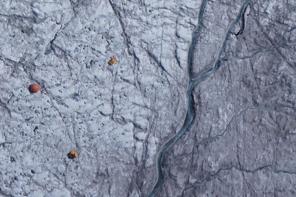 Image: This drone image was captured on Aug. 5, 2014, and offers a view of the tents and scientific equipment in the Dark Snow Project. Dark ice, rich with impurities, was particularly visible east of the melt stream near the camp. (Photo: Dark Snow Project. J. Ryan/ J.Box /A.Hubbard)