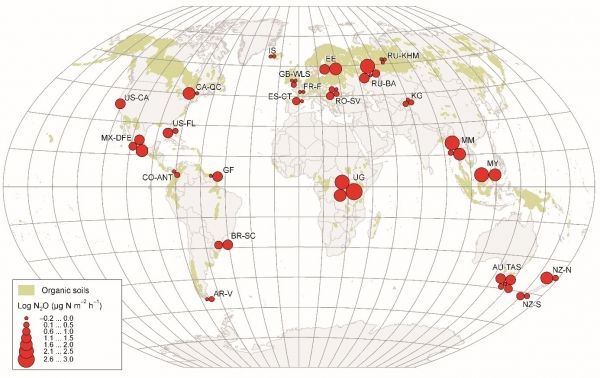 Image: The studied areas and their average measured laughing gas emission on the map of the world’s organic soils. CREDITS: Pärn et al., 2018.