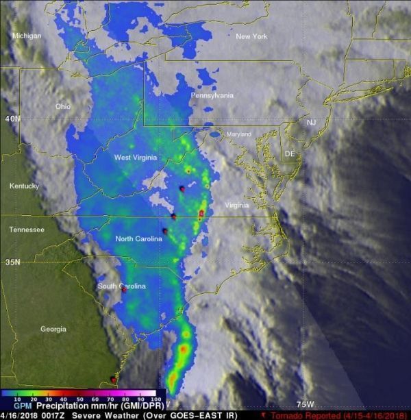 GPM captured an image of the advancing line of storms on April 16 at 00:17 UTC (8:17 pm EDT, April 15) about one hour after the tornado was reported near Lynchburg, Virginia. The image showed instantaneous surface precipitation rates estimated from the GPM.