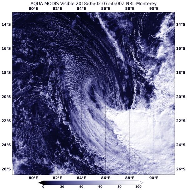 At 11 p.m. EDT on May 1, or 0300 UTC on May 2, the Joint Typhoon Warning Center (JTWC) issued their final warning on the system. At that time the center of Tropical Cyclone Flamboyan was located near 19.1 degrees south and 84.6 degrees east, about 983 nautical miles southeast of Diego Garcia. The storm was moving toward the south-southeast at 5.7 mph (5 knots/9.2 kph). Maximum sustained winds are near 46 mph (40 knots/74 kph).