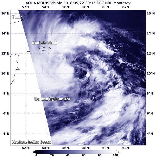 Image: On May 22 at 5:15 a.m. EDT (0915 UTC), NASA's Aqua satellite captured a visible image of Tropical Cyclone 02A about 650 miles south of Masirah Island, Oman. The image strong thunderstorms around the center of circulation and in a band from north to northwest of the center. CREDITS: NASA / NRL