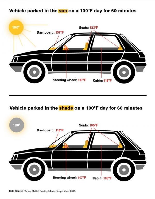 Image: Cars can become deadly after one hour in the sun on a hot summer day. (Credit: Graphic by Safwat Saleem/ASU)