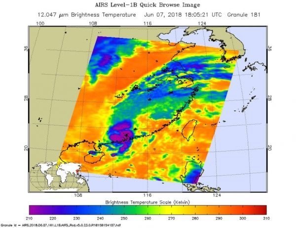 When NASA's Aqua satellite passed over the South China Sea on June 7 infrared imagery showed Tropical Storm Ewiniar's center made landfall in southeastern China.