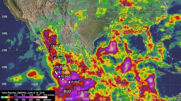 Photo: IMERG data generated during the period from June 9 to 18, 2018. IMERG showed Bud produced the heaviest rainfall over the open waters of the eastern Pacific where over 512 mm (20.2 inches) fell. IMERG estimates indicated that the heaviest rainfall over land occurred in northwestern Mexico with over 200 mm (7.9 inches) indicated. CREDITS: NASA / JAXA, Hal Pierce