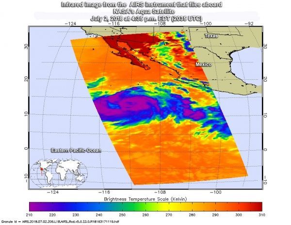 NASA's Aqua satellite passed over Hurricane Fabio on July 2 at 4:35 p.m. EDT (2035 UTC) .The Atmospheric Infrared Sounder or AIRS instrument analyzed the storm in infrared light which provides temperature information. Temperature is important when trying to understand how strong storms can be. The higher the cloud tops, the colder and the stronger they are. Cloud top temperatures were as cold as minus 63 degrees Fahrenheit (minus 53 degrees Celsius). Storms with cloud top temperatures that cold have the capability to produce heavy rainfall.