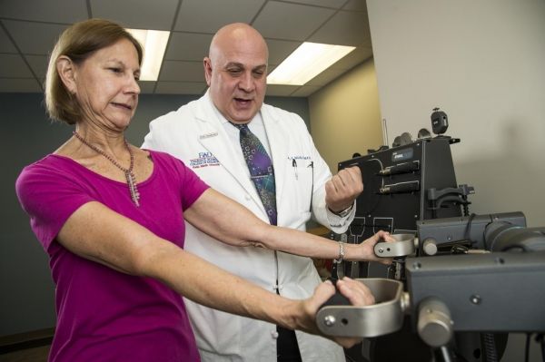 Image: James E. Galvin, M.D., M.P.H., tests a patient's muscle strength in FAU's Comprehensive Center for Brain Health. (Credit: Florida Atlantic University)