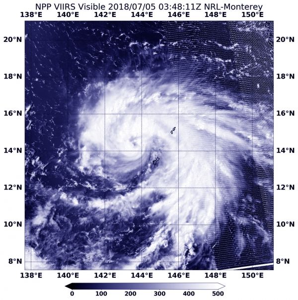NASA-NOAA’s Suomi NPP satellite flew over Typhoon Maria on July 5 at 0348 UTC (July 4 at 11:48 a.m. EDT). The Visible Infrared Imaging Radiometer Suite (VIIRS) instrument aboard NASA-NOAA's Suomi NPP satellite captured a visible image that showed the center of Maria had moved to the west of Guam, and a large band of thunderstorms wrapping into the center and extended to the east, stretched over the island.