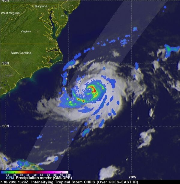 On July 11, Chris became a category two hurricane on the Saffir-Simpson hurricane wind scale. The GPM core observatory satellite flew above Chris on July 10, 2018 at 9:29 a.m. EDT (1329 UTC) when Chris was becoming a hurricane. Chris' movement toward the northeast over warmer waters east of the Atlantic coast were assisting in the tropical cyclone's intensification. GPM's Microwave Imager (GMI) and