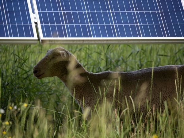Photo: Sheep provided by a local 4-H club help with vegetation management at a solar array owned by the Eau Claire Electric Co-op in Wisconsin. CREDIT: NRECA