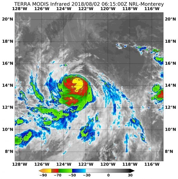 MODIS found cloud top temperatures of strongest thunderstorms were as cold as or colder than minus 80 degrees Fahrenheit (minus 62.2 Celsius) around the small eye. Cloud top temperatures that cold indicate strong storms that have the capability to create heavy rain.