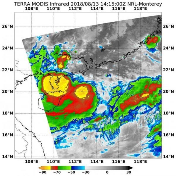 On Aug. 13 at 10:15 a.m. EDT (1415 UTC) the Moderate Resolution Imaging Spectroradiometer or MODIS instrument aboard NASA's Aqua satellite analyzed Tropical Storm Bebinca's cloud top temperatures in infrared light. MODIS found cloud top temperatures of strongest thunderstorms were as cold as or colder than minus 80 degrees Fahrenheit (minus 62.2 Celsius) around the center. Cloud top temperatures that cold indicate strong storms that have the capability to create heavy rain.