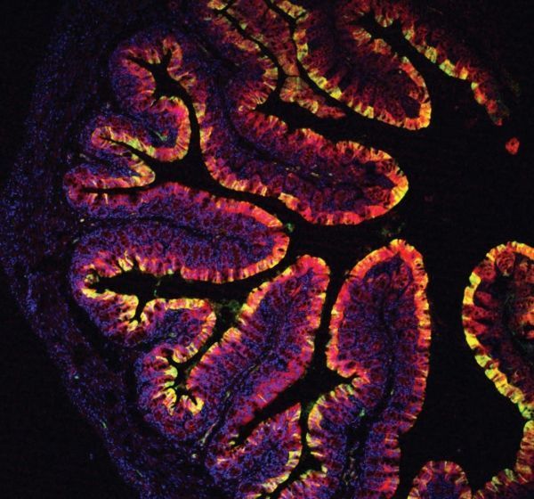 Image: This is a mouse colon from Cyp1a reporter mice after feeding with I3C. (Credit: Chris Schiering, Francis Crick Institute)