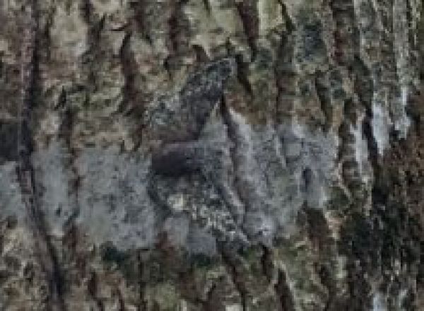 The common pale form of the moth is camouflaged against lichen growing on tree bark. During the Industrial Revolution – when pollution killed lichen and bark was darkened by soot – a darker-winged form emerged in the UK.