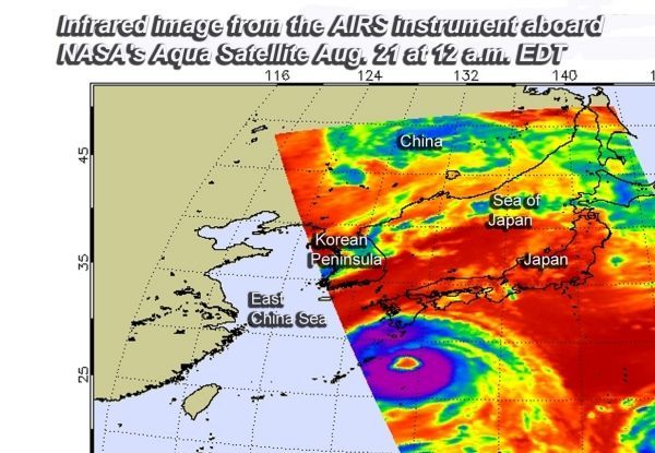Image: On Aug. 21 at 12:00 a.m. EDT (0400 UTC) the AIRS instrument aboard NASA's Aqua satellite showed very strong thunderstorms (purple) as cold as or colder than minus 63 degrees Fahrenheit (minus 53 Celsius) surrounding Typhoon Soulik's 50-mile-wide eye. CREDITS: NASA JPL, Heidar Thrastarson