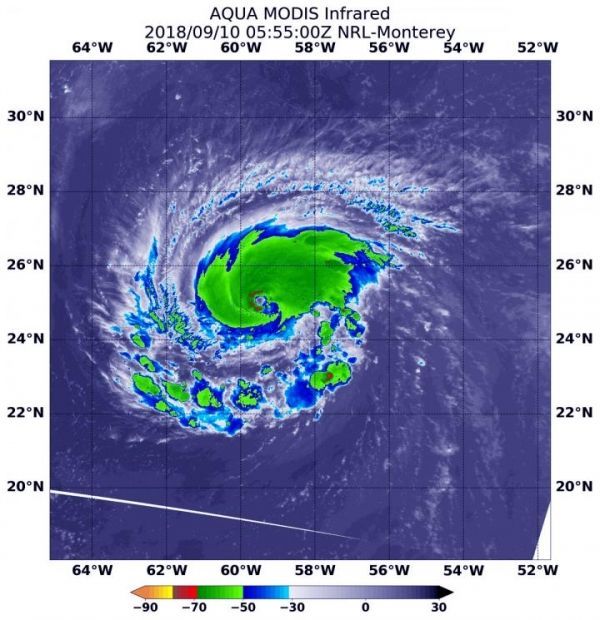 Image: At 1:55 a.m. EDT (0555 UTC) on Sept. 10, the MODIS instrument aboard NASA's Aqua satellite looked at Hurricane Florence in infrared light. MODIS found coldest cloud tops (red) had temperatures near minus 70 degrees Fahrenheit (minus 56.6 degrees Celsius) in the northern and western eyewall. (Credit: NASA/NRL)