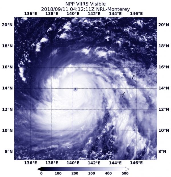 On Sept. 11 at 12:12 a.m. EDT (0412 UTC) the Visible Infrared Imaging Radiometer Suite (VIIRS) instrument aboard NASA-NOAA’s Suomi NPP satellite captured visible image of Super Typhoon Mangkhut. The image showed a clear eye surrounded by bands of powerful thunderstorms.