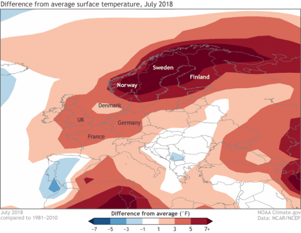 It’s more like what hasn’t happened a lot. And that’s rain. A prolonged dry spell coupled with soaring, record-breaking temperatures has been a horrible combination for farms from Scandinavia and England in the north to France, Netherlands, and Germany to the south. In particular, July was incredibly hot for northern Europe.