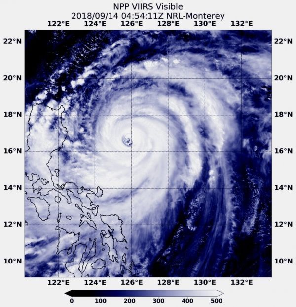 Image: At 12:54 a.m. EDT (0454 UTC) on Sept. 14, the VIIRS instrument aboard NASA-NOAA’s Suomi NPP satellite captured a visible image of Super Typhoon Mangkhut approaching the Philippines. CREDIT: NASA / NRL