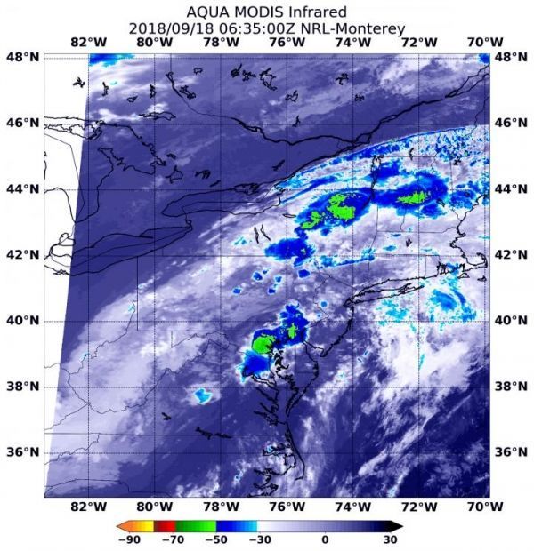 At 2:35 a.m. EDT (0635) on Sept. 18, the Moderate Resolution Imaging Spectroradiometer or MODIS instrument aboard NASA’s Aqua satellite analyzed Post-Tropical Cyclone Florence in infrared light. MODIS found several areas of coldest cloud top temperatures and strongest storms located over several U.S. states: Maryland, Delaware, northeastern upstate New York, central Vermont and New Hampshire.