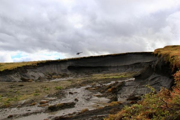Image: Pictured here is a permafrost thaw slump that is exposing sediment- and ice-rich permafrost on the Peel Plateau in Canada's Northwest Territories. (Credit: Scott Zolkos)
