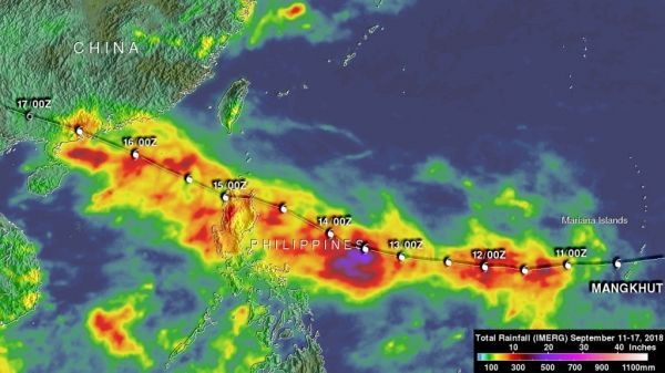 Image: The NASA analysis showed IMERG rainfall estimates over the western Pacific Ocean during the period from September 11-17, 2018. Rainfall totals above 300 mm (11.8 inches) were often indicated along Mangkhut’s path. The highest rainfall accumulation estimates of over 700 mm (27.6 inches) were shown by IMERG south of Mangkhut’s track in the Philippine Sea. CREDIT: NASA / JAXA, Hal Pierce