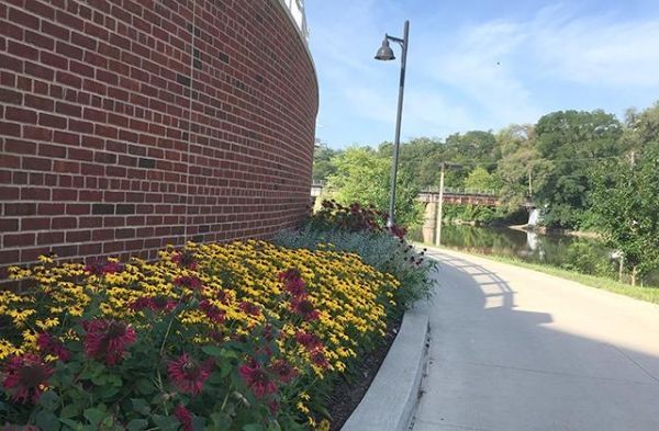 The flowers mingle beautifully in a late-summer breeze along the west patio of the Iowa Memorial Union, the dark crimson petals of bee balm providing a perfect contrast to the golden blossom of the black-eyed Susan and the orange glow of the blanket flower.