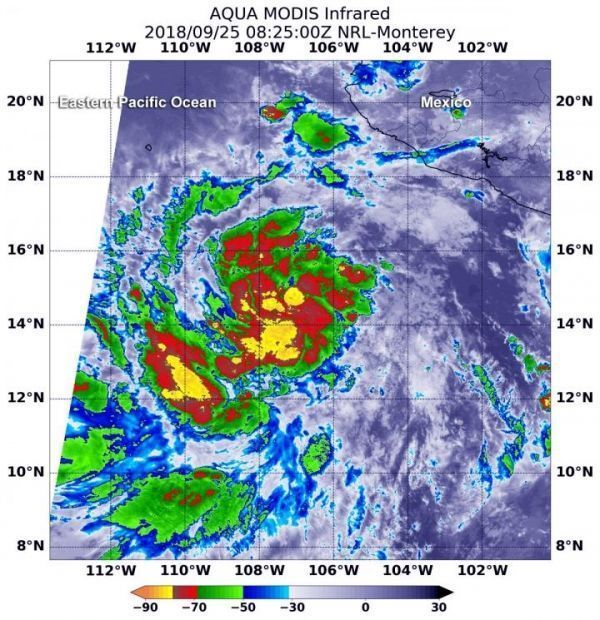 NASA’s Aqua satellite passed over the Eastern Pacific early on Sept. 25 when Rosa was still a tropical depression called 20E. Infrared satellite data taken at 4:25 a.m. EDT (0825 UTC) on Sept. 25 from the Moderate Resolution Imaging Spectroradiometer or MODIS instrument aboard NASA’s Aqua satellite revealed strongest storms with the coldest cloud top temperatures around 20E’s center and in a band of thunderstorms southwest of center.