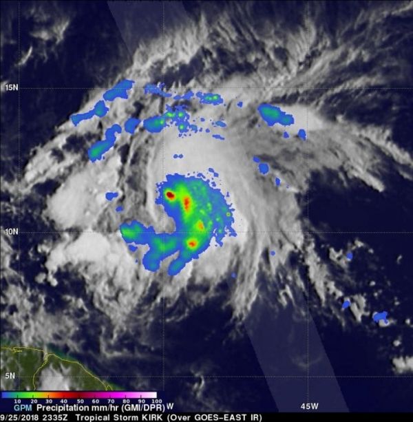 The GPM core observatory satellite scanned reviving tropical storm Kirk on September 25, 2018 at 7:35 p.m. (2335 UTC). Data collected by the satellite’s Microwave Imager (GMI) instrument showed that intense convective precipitation was taking place near the center of the reviving tropical storm. GMI’s scans indicated that rain was falling at over 71 mm (2.8 inches) in some of these storms. GPM’s Dual-Frequency Precipitation Radar (DPR) probed storms that were located to the east and northeast of the center of the regenerating tropical storm. DPR found rain there falling at a rate of over 69 mm (2.7 inches) per hour.