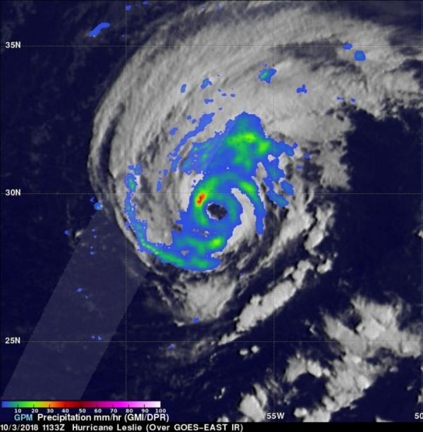 Image: The GPM or Global Precipitation Measurement mission core observatory satellite passed above Hurricane Leslie on Oct. 3, 2018 at 7:33 a.m. EDT (1133 UTC) and found rain was falling at over 1.8 inches (45.7 mm) per hour within storms located in the northwestern side of the Leslie's eye wall. (Credit: NASA/JAXA, Hal Pierce)
