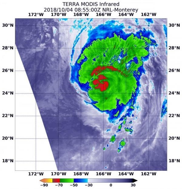 Image: NASA's Terra satellite observed Hurricane Walaka in the Central Pacific Ocean on Oct. 4 at 4:55 a.m. EDT (0855 UTC). Infrared light that revealed cloud top temperatures were coldest (red) as cold as minus 70 degrees Fahrenheit (minus 56.6 degrees Celsius). (Credit: NASA/NRL)